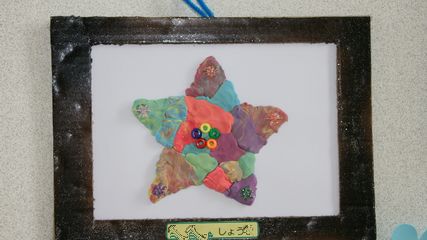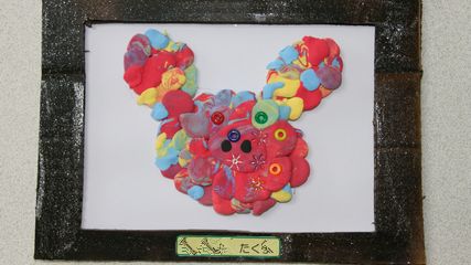 作品は、画用紙にイラストの枠が描かれたものがあって、絵具を混ぜた紙粘土を貼り付けて作成したようです。色んな色を混ぜたり、重ねたりして、楽しく作成できたようです。
